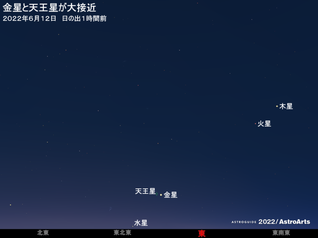 6月上旬から中旬ごろ、明け方の東の低空で、金星と天王星が大接近する。最接近は6月12日ごろ。
