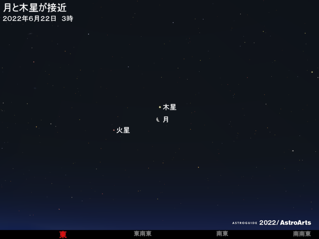 6月22日の未明から明け方、東南東から南東の空で月と木星が接近する。