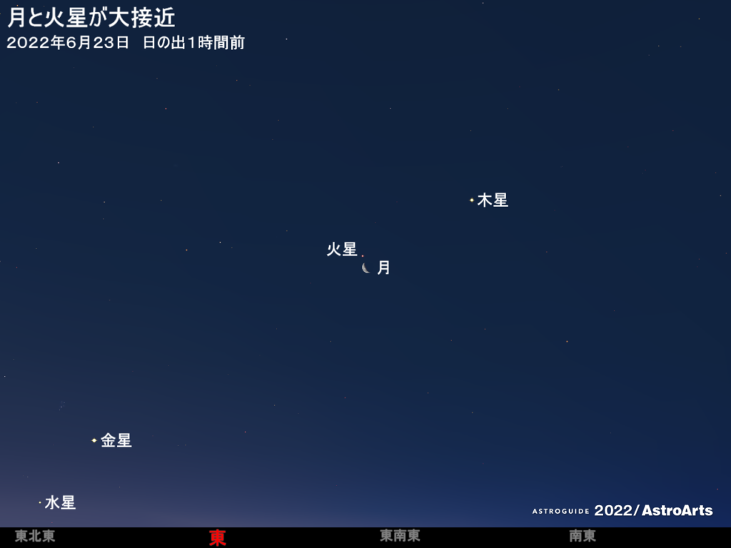 6月23日の未明から明け方、東から東南東の空で月と火星が大接近する。