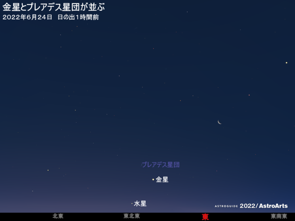 金星とプレアデス星団が並ぶ 6月下旬ごろ、未明から明け方の東北東の低空で、金星とプレアデス星団が並ぶ。最接近は6月24日ごろ。