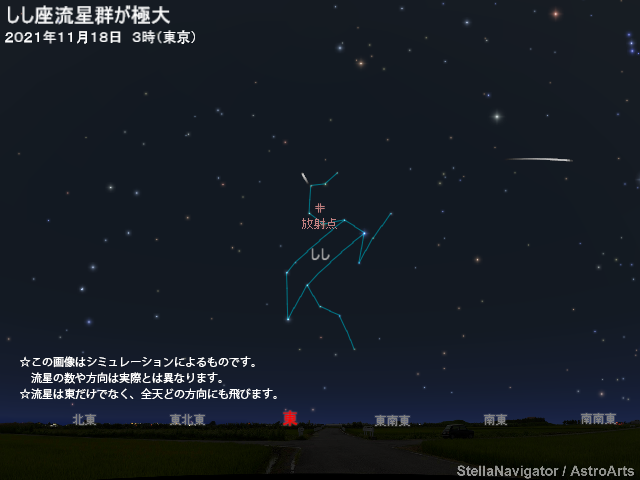 「しし座流星群」とは、毎年11月に活発になる、しし座の付近を放射点として出現する流星群です。