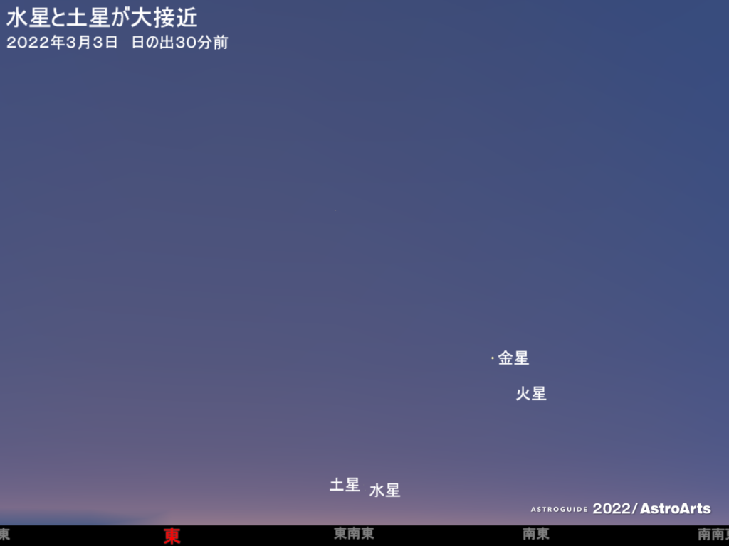 3月上旬ごろ、明け方の東南東の低空で、水星と土星が大接近する。最接近は3月3日ごろ。