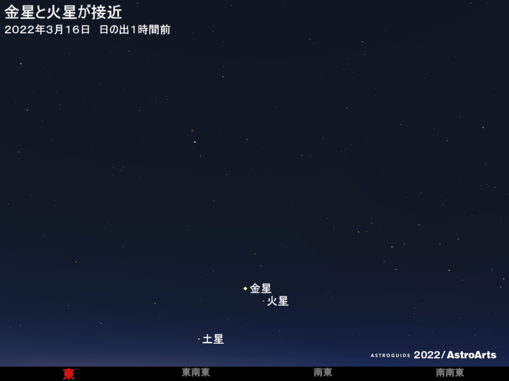3月中旬から下旬ごろ、未明から明け方の東南東の低空で、金星と火星が接近する。最接近は3月16日ごろ。