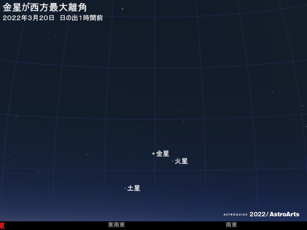 3月20日、未明から明け方の東南東の空で輝いている明けの明星の金星が太陽から最も離れて西方最大離角となる。