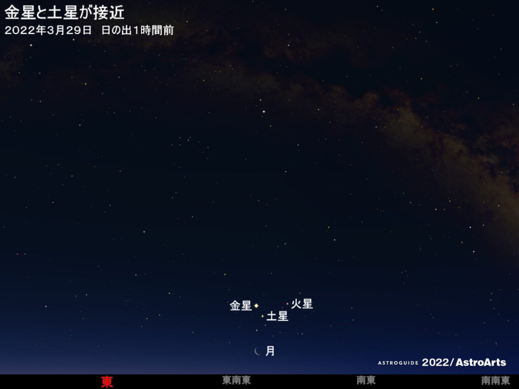 3月下旬から4月上旬ごろ、未明から明け方の東南東の低空で、金星と土星が接近する。最接近は3月29日ごろ。