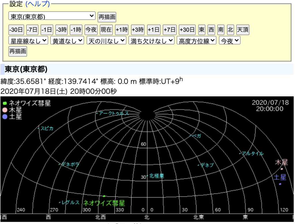 ④ 20時にセットし、ネオワイズ彗星の位置を確認