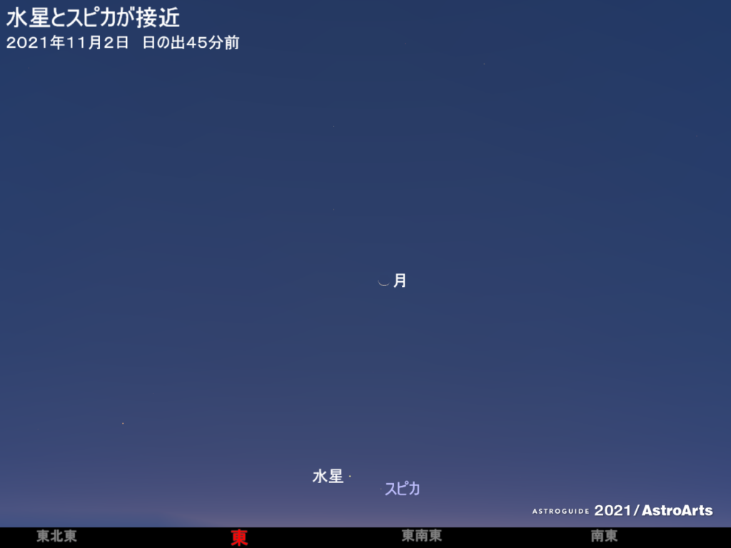 11月上旬ごろ、明け方の東南東の低空で、水星とスピカが接近する。最接近は11月2日ごろ。