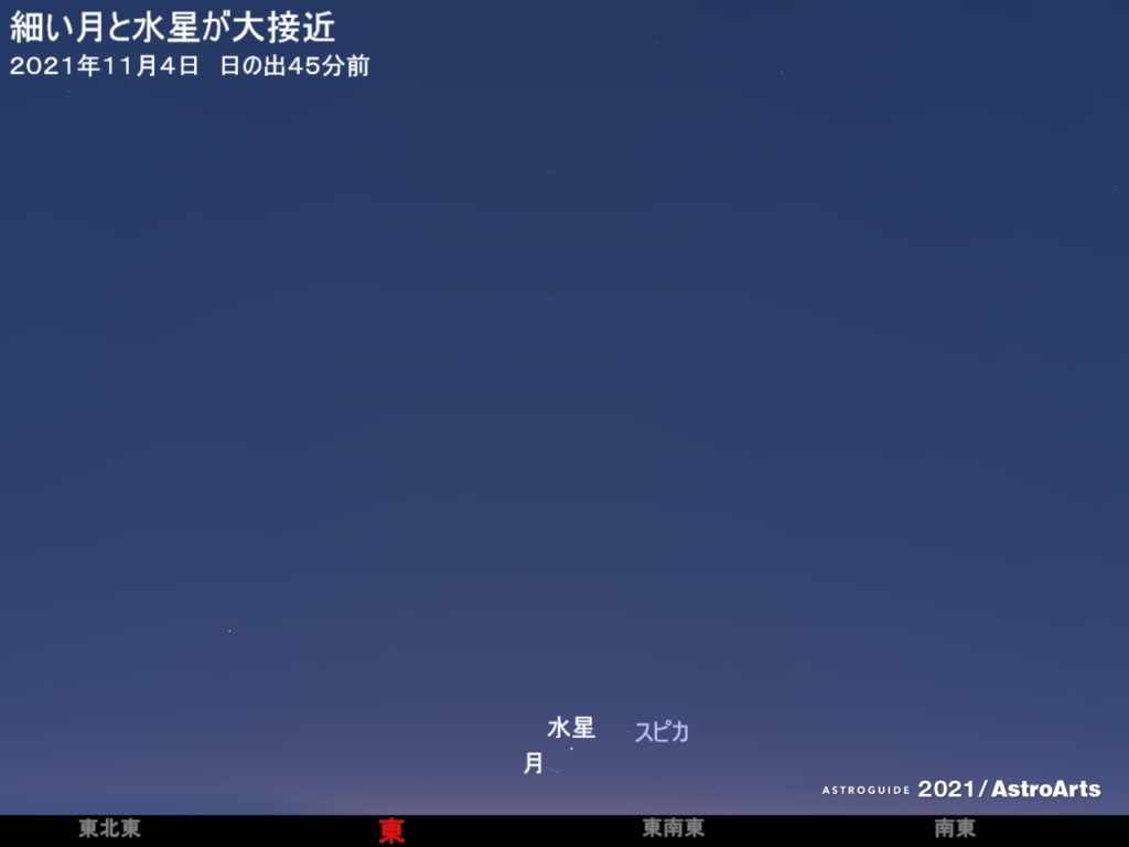 11月4日の明け方、東南東の低空で細い月と水星が大接近する。