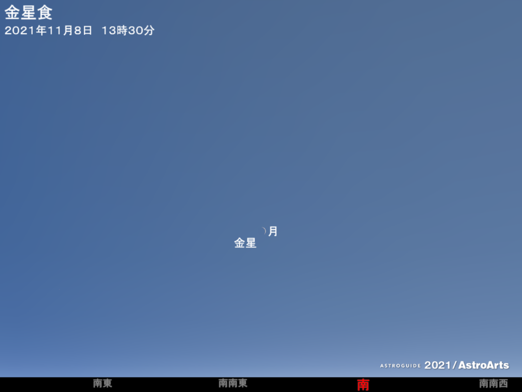金星食/細い月と金星が大接近 11月8日の13時30分から15時ごろ、細い月が金星を隠す金星食が起こる。夕方から宵には、南西の低空で細い月と金星が大接近する。