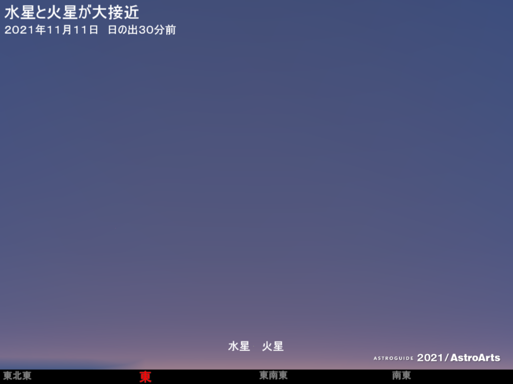 11月上旬から中旬ごろ、明け方の東南東の低空で、水星と火星が大接近する。最接近は11月11日ごろ。