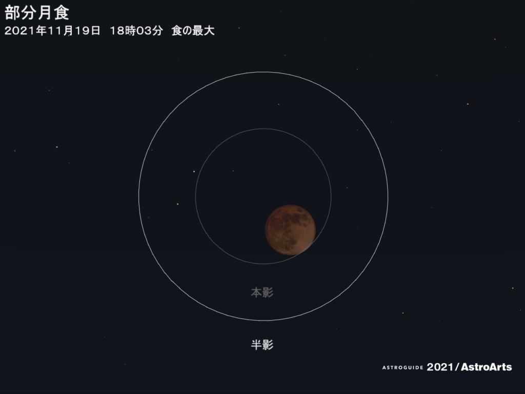 11月19日の夕方から宵、部分月食が起こる。東北地方南部より南では月出帯食となる。