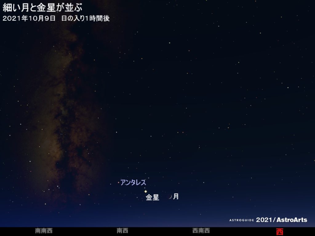 10月9日の夕方から宵、南西の低空で細い月と金星が並ぶ。
