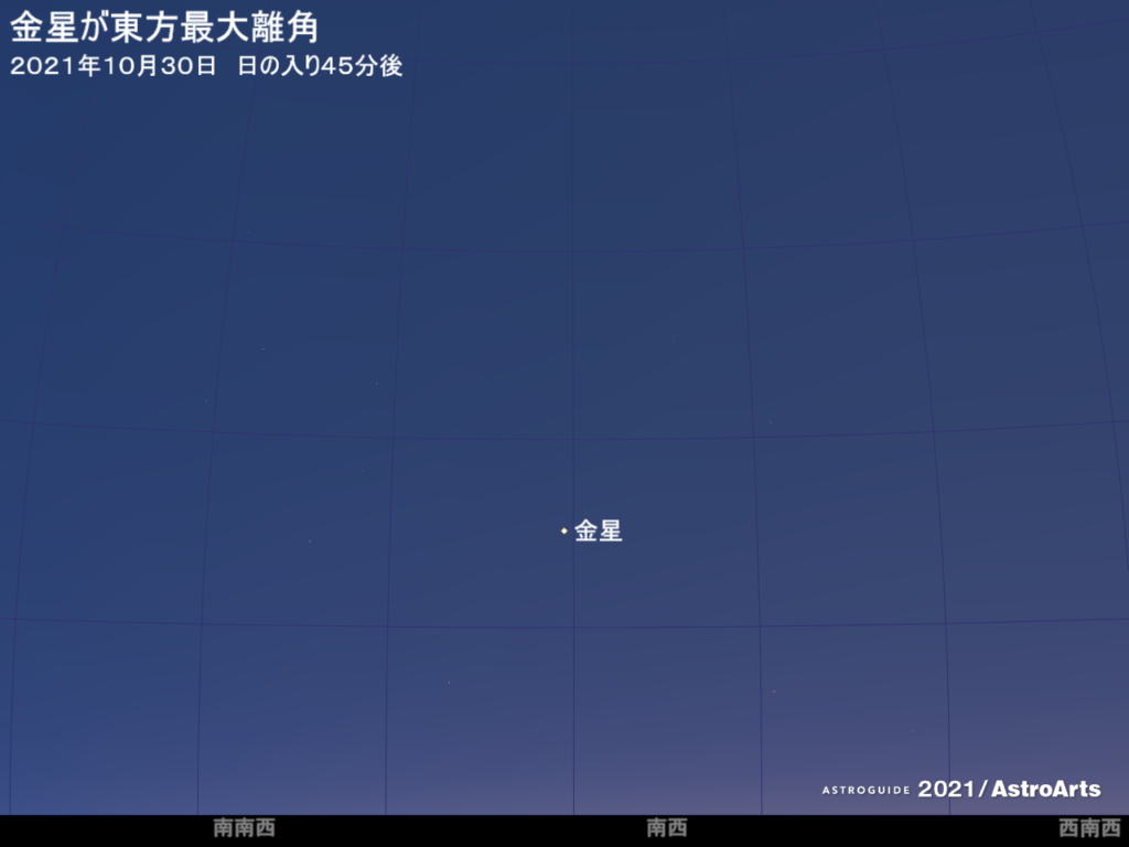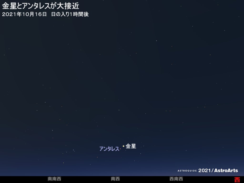 10月中旬ごろ、夕方から宵の南西の低空で、金星とアンタレスが大接近する。最接近は10月16日ごろ。