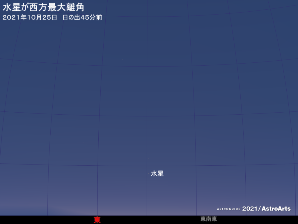 水星が西方最大離角 10月25日、明け方の東の低空に見えている水星が太陽から最も離れて西方最大離角となる。