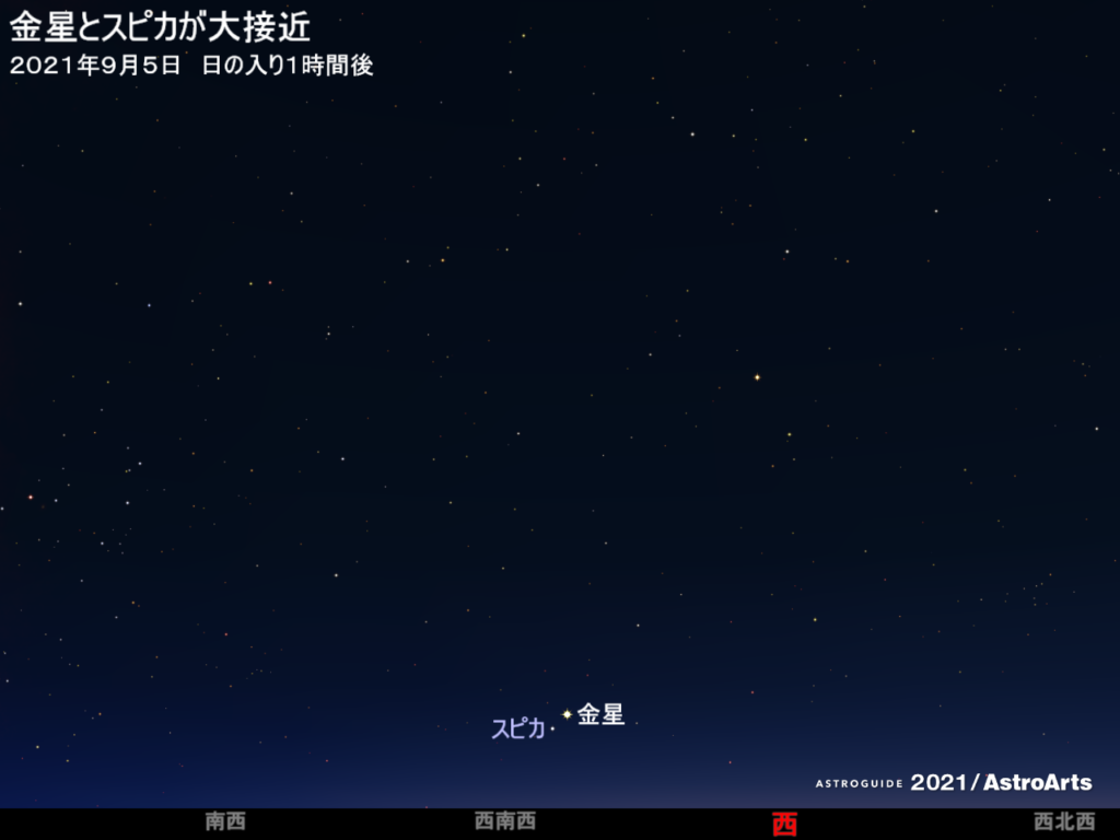 9月上旬ごろ、夕方から宵の西南西の低空で、金星とスピカが大接近する。最接近は9月5日ごろ。