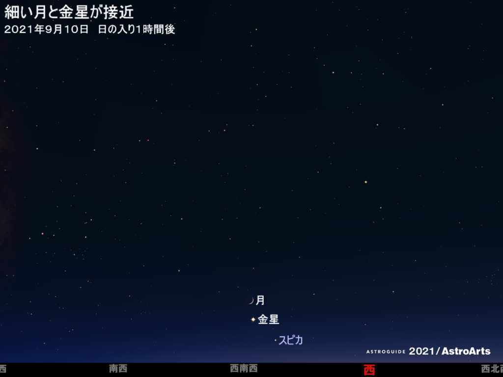 9月10日の夕方から宵、西南西の低空で細い月と金星が接近する。