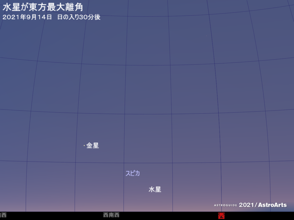 9月14日、夕方の西南西の低空に見えている水星が太陽から最も離れて東方最大離角となる。