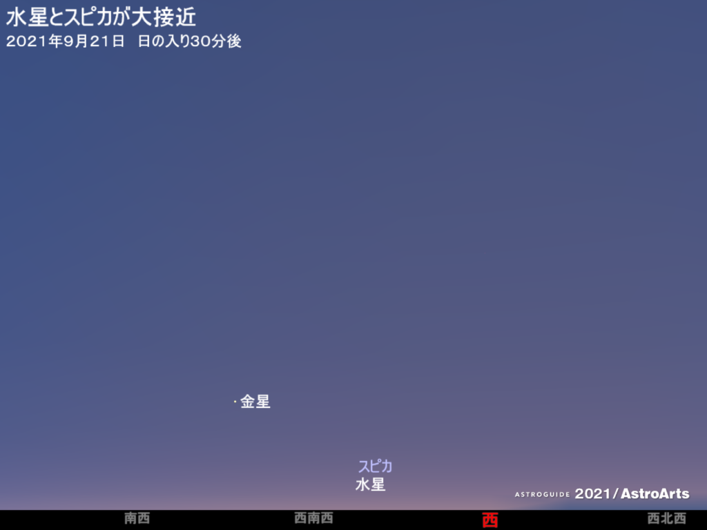 9月中旬から下旬ごろ、夕方の西南西の低空で、水星とスピカが大接近する。最接近は9月21日ごろ。