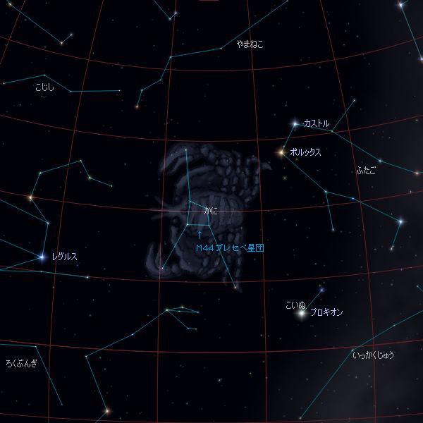 「しし座」のすぐ西側に見えます。一番の見所はカニの甲羅にある「M44プレセペ星団」です。この星団は双眼鏡でも簡単に見つけることができます。