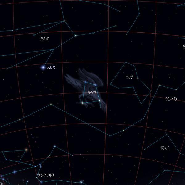 おとめ座の下で春の大曲線の終点に位置する星座です。4つの3等星が作るつぶれた台形が目印です。