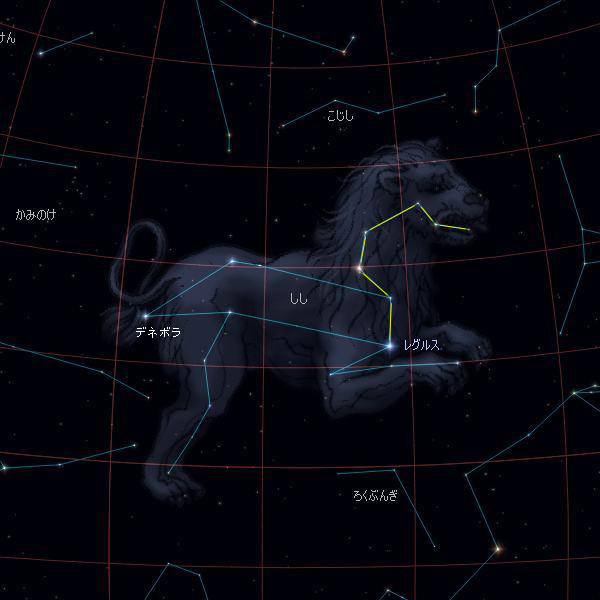 左には、ライオンの胴体を形作る星が並んでいます。ライオンの胸で明るく光っている星は、1等星のレグルスという星です。尻尾には2等星のデネボラという星があります。