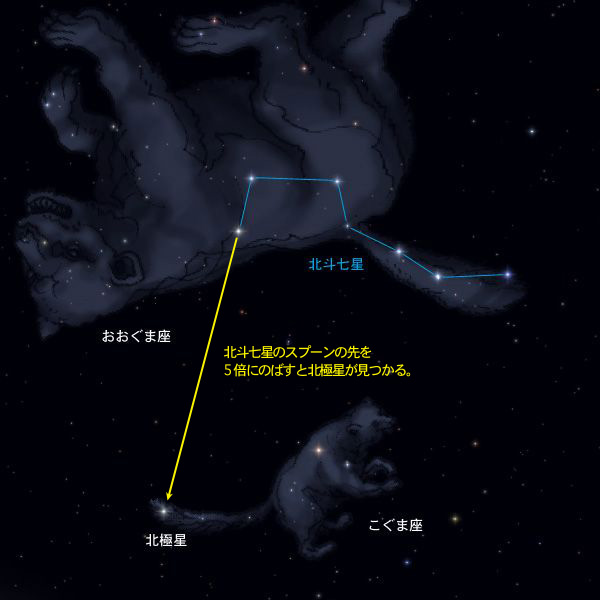 子グマのシッポの先にある星が北極星です。こぐま座は、一年中、北の空で見つけることができます。