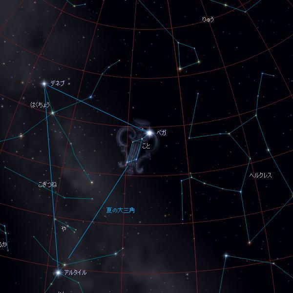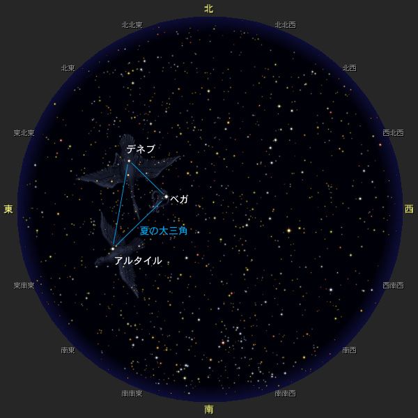 東を向いて見える一番明るい星が「こと座」のベガです。ベガから右下の方向にある「わし座」のアルタイル、ベガから左下の方向の「はくちょう座」のデネブ、この3つの星を結んだ三角形を「夏の大三角」といい、夏の星座の目印です。