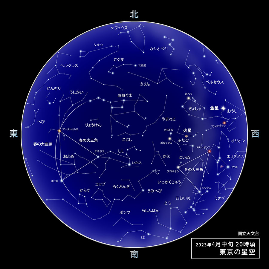 | 2023年4月12日 | 水星が東方最大離角 2023年4月12日、夕方から宵の西北西の低空に見えている水星が太陽から最も離れて東方最大離角となる。 |